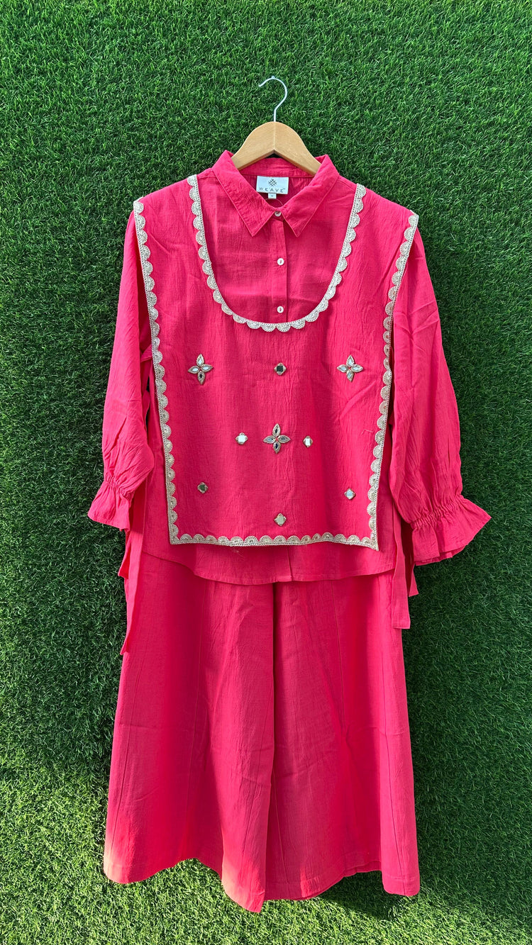 The set features handcrafted lace embellishments on vest , adding a delicate shimmer and a hint of bohemian allure, this outfit is ideal for resort getaways, festive brunches, or evening gatherings.