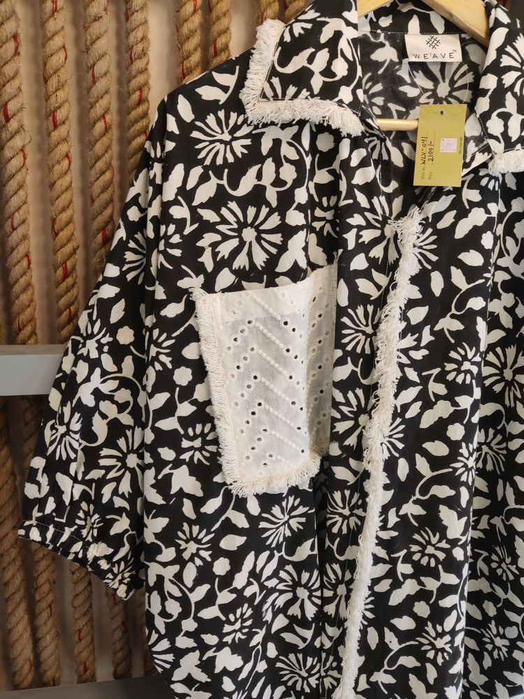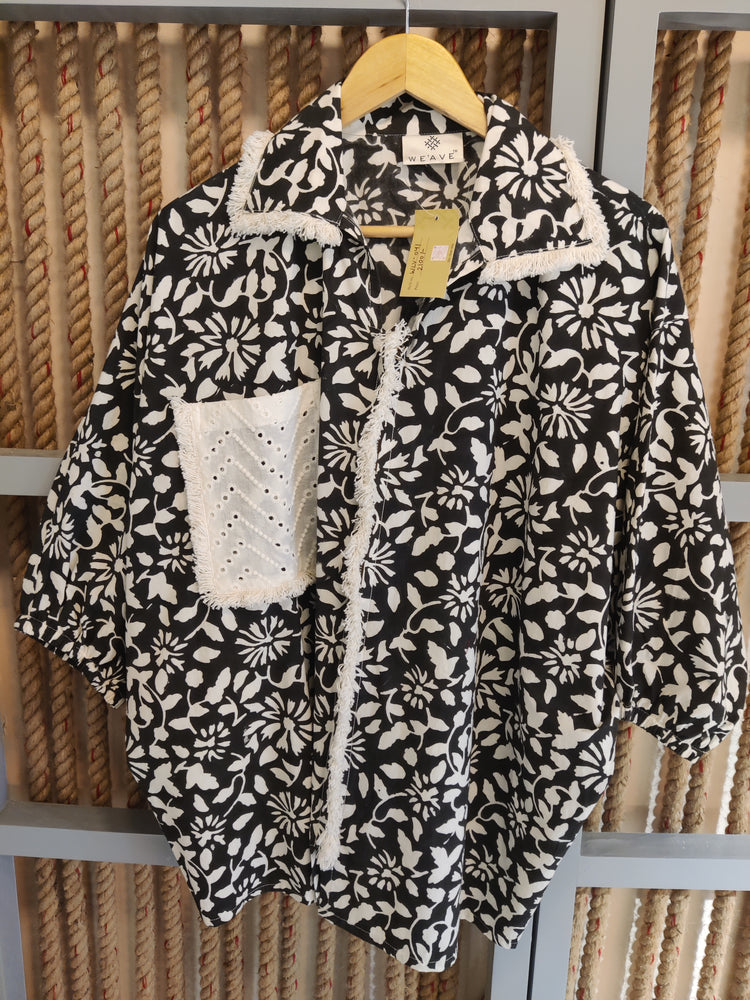 Embrace effortless style with our Block Beauty Shirt. This vibrant piece features a charming block print, accented by a stylish shiffly pocket and delicate lace detailing along the placket, pocket, and collar. Perfect for layering or wearing solo, it brings a touch of bohemian flair to any outfit.