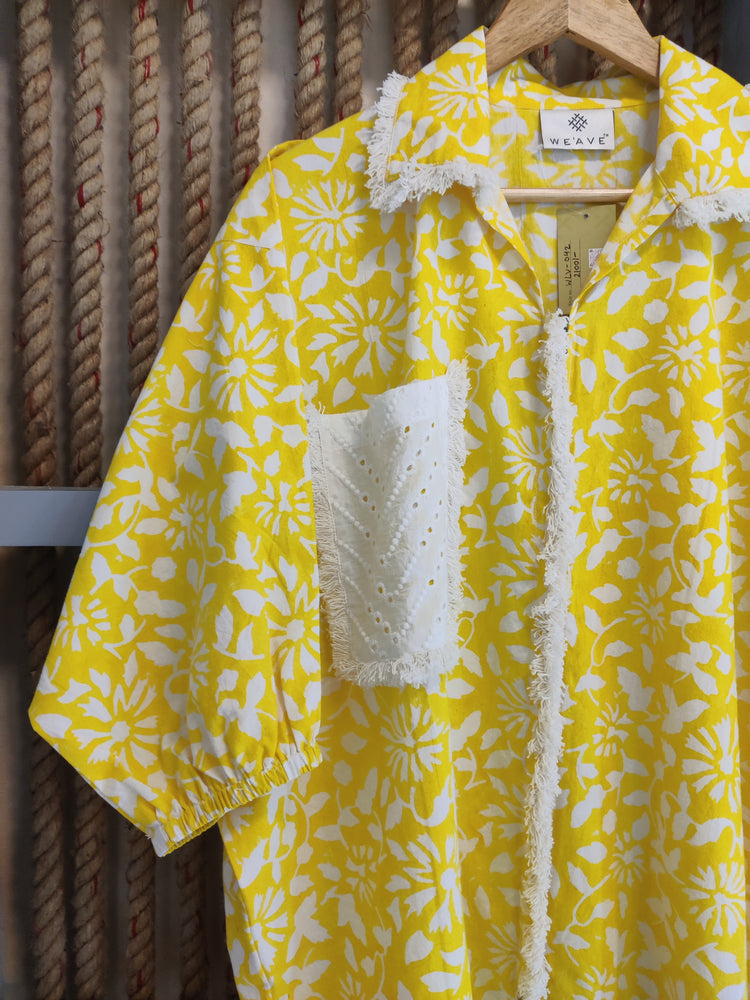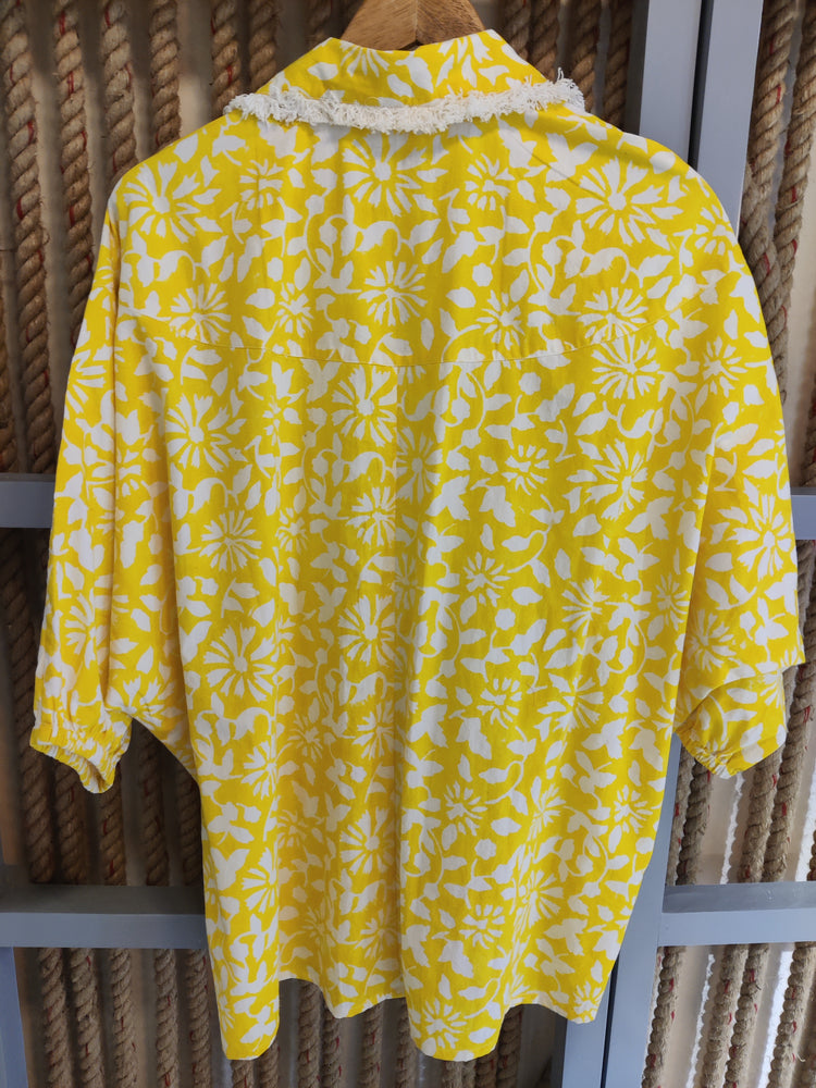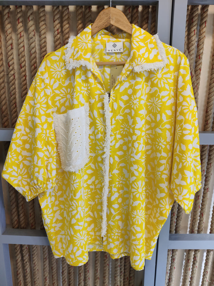 Embrace effortless style with our Yellow Boho Shirt. This vibrant piece features a charming block print, accented by a stylish shiffly pocket and delicate lace detailing along the placket, pocket, and collar. Perfect for layering or wearing solo, it brings a touch of bohemian flair to any outfit.