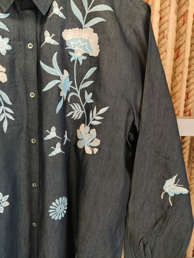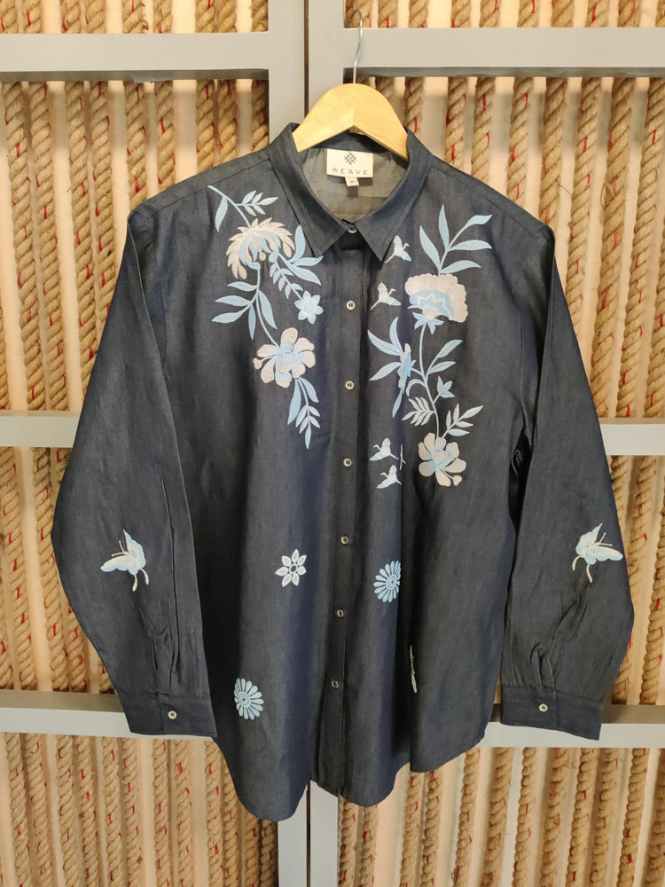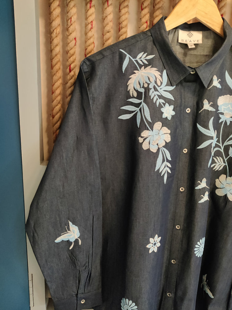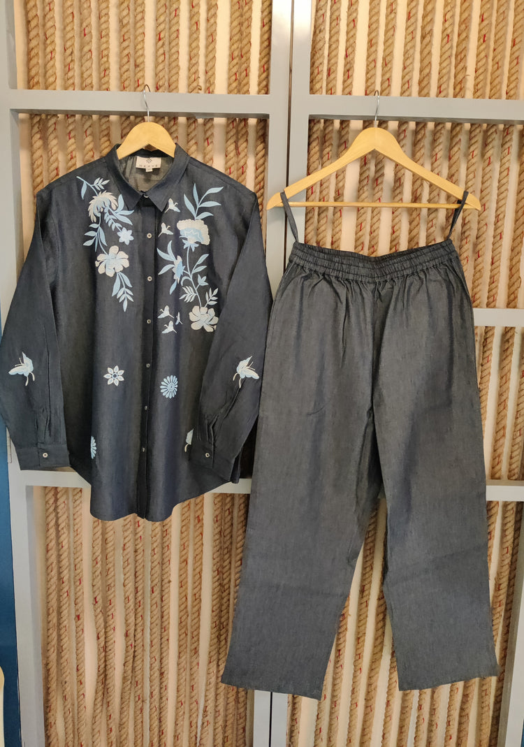 Elevate your style with the Blue Blossom Denim Co-ord Set, featuring a chic denim shirt adorned with delicate floral embroidery paired with matching trousers. This coordinated ensemble combines comfort and elegance, making it perfect for brunches, casual outings, or relaxed evenings with a touch of sophistication.
