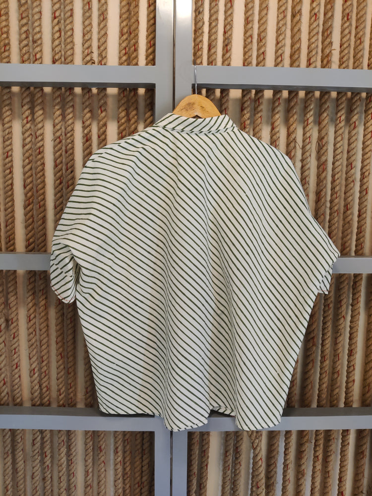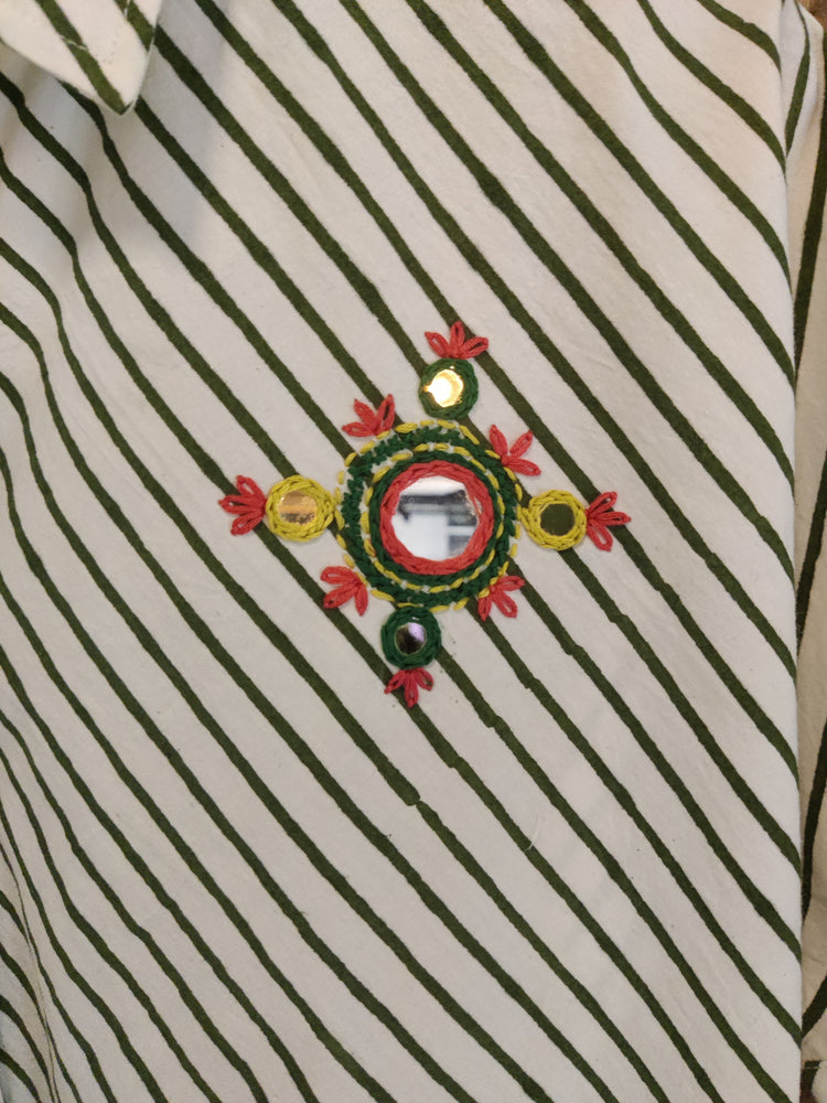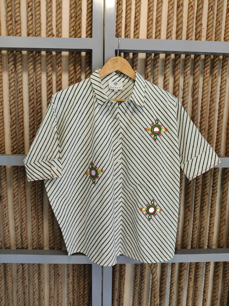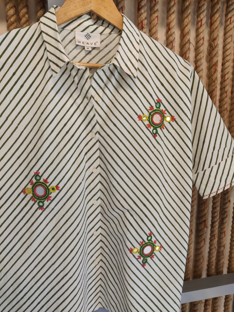 Bring a fresh, vibrant touch to your wardrobe with the Aina Green Striped Shirt, featuring striking green stripes enhanced with intricate mirror work. This shirt seamlessly blends bold stripes with shimmering mirror detailing, creating a unique and stylish look. Ideal for both casual and semi-formal occasions, it adds a perfect balance of modern flair and traditional craftsmanship to any ensemble.