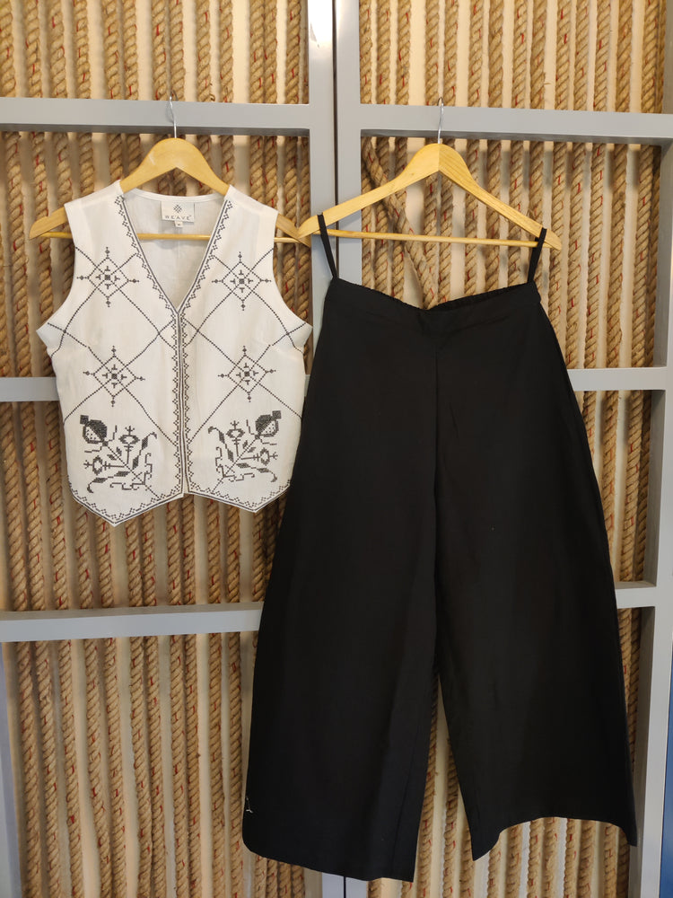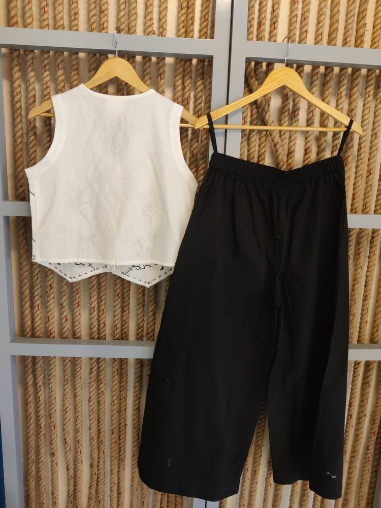 Step into sophistication with the Crossover White Co-ord Set, featuring a stylishly designed top that elegantly crosses over at the front, paired with sleek black pants. This timeless ensemble is perfect for evening events or stylish gatherings, offering a chic look that exudes confidence and versatility. Whether dressed up with heels or kept casual with flats, this set is a must-have for your wardrobe.