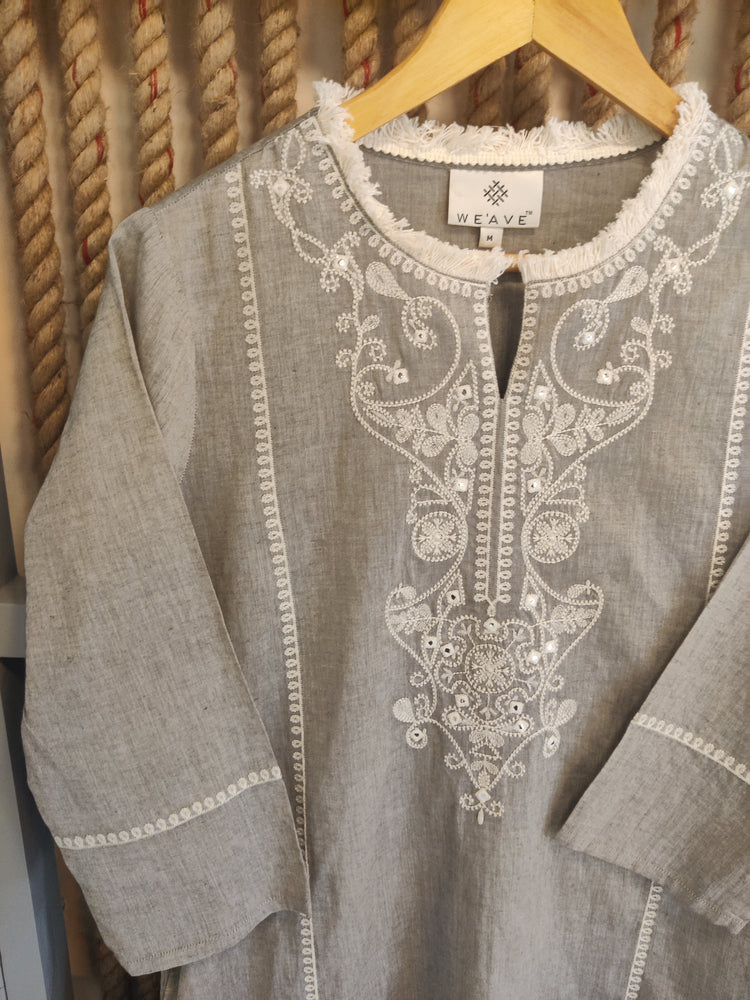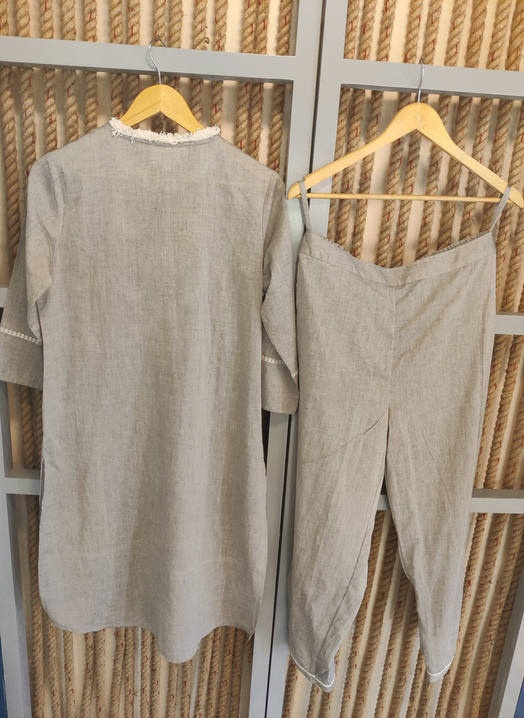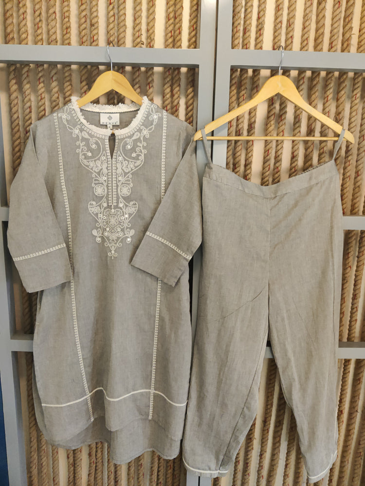 Bloom in style with this elegant ensemble, featuring a kurta embellished with intricate embroidery and delicate lace accents, paired with straight-cut pants. Ideal for daytime events or festive occasions, this set brings together timeless charm and modern sophistication.