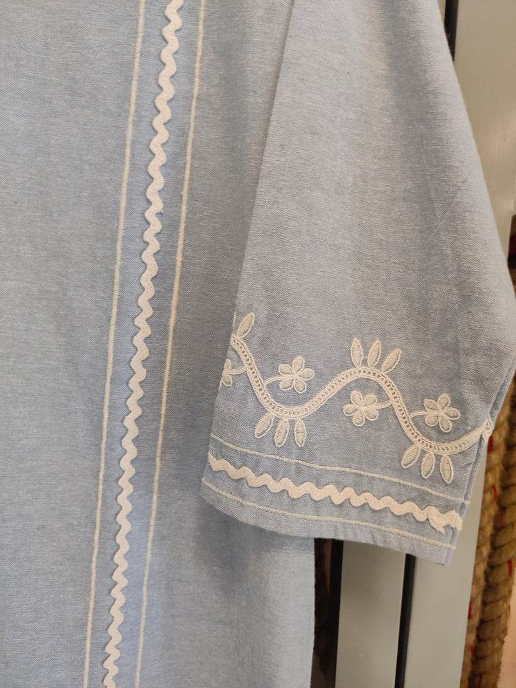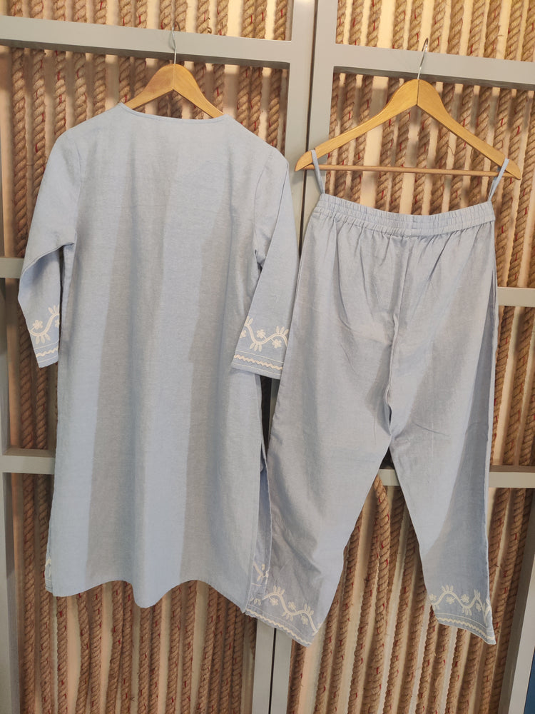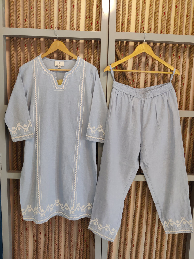 Bloom in style with this elegant ensemble, featuring a kurta embellished with intricate embroidery and delicate lace accents, paired with straight-cut pants. Ideal for daytime events or festive occasions, this set brings together timeless charm and modern sophistication.