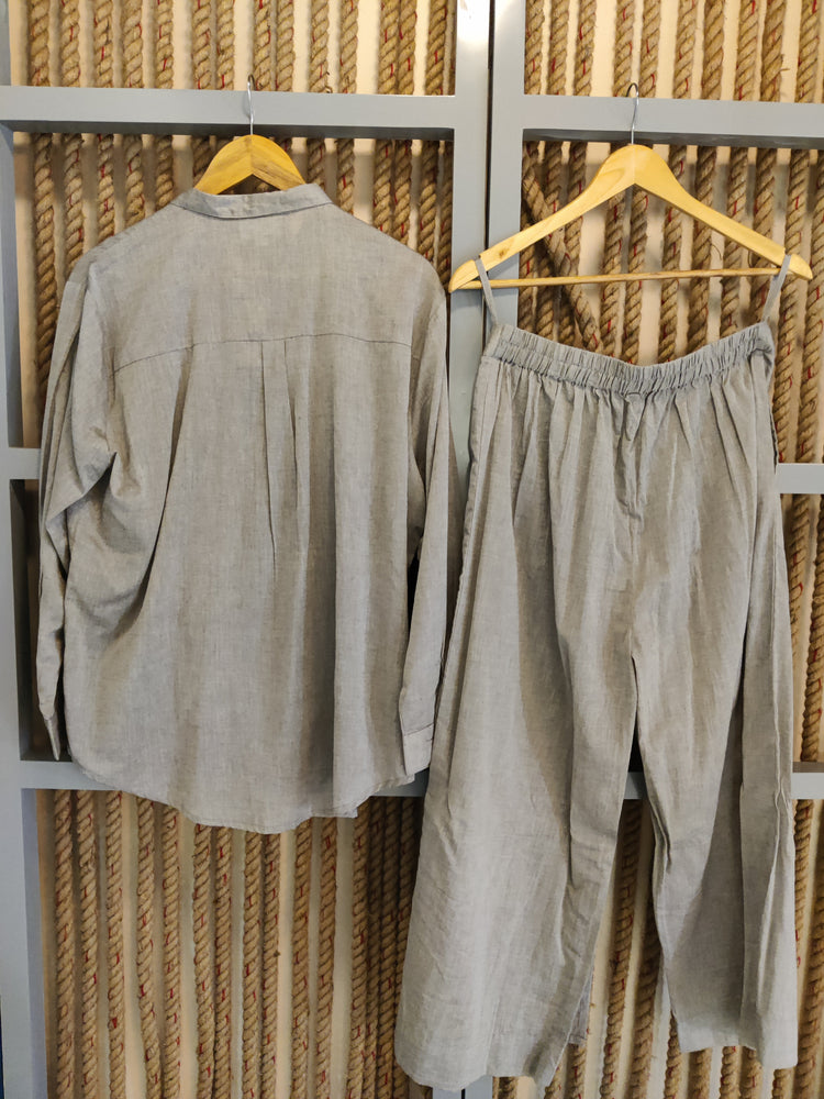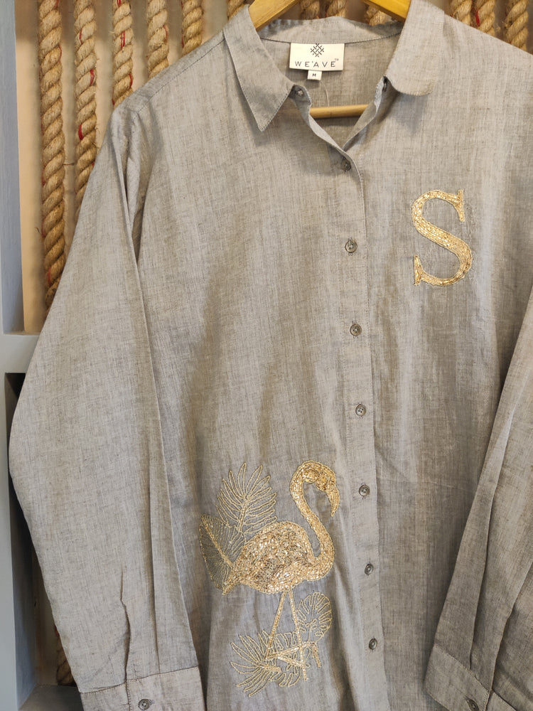 Add a personal touch to your style with this unique co-ord set, featuring a customizable shirt with pants adorned with intricate gota work. Personalize your look by adding your initials to the shirt, perfect for celebrations or as a statement piece with a blend of tradition and individuality.