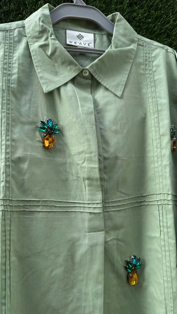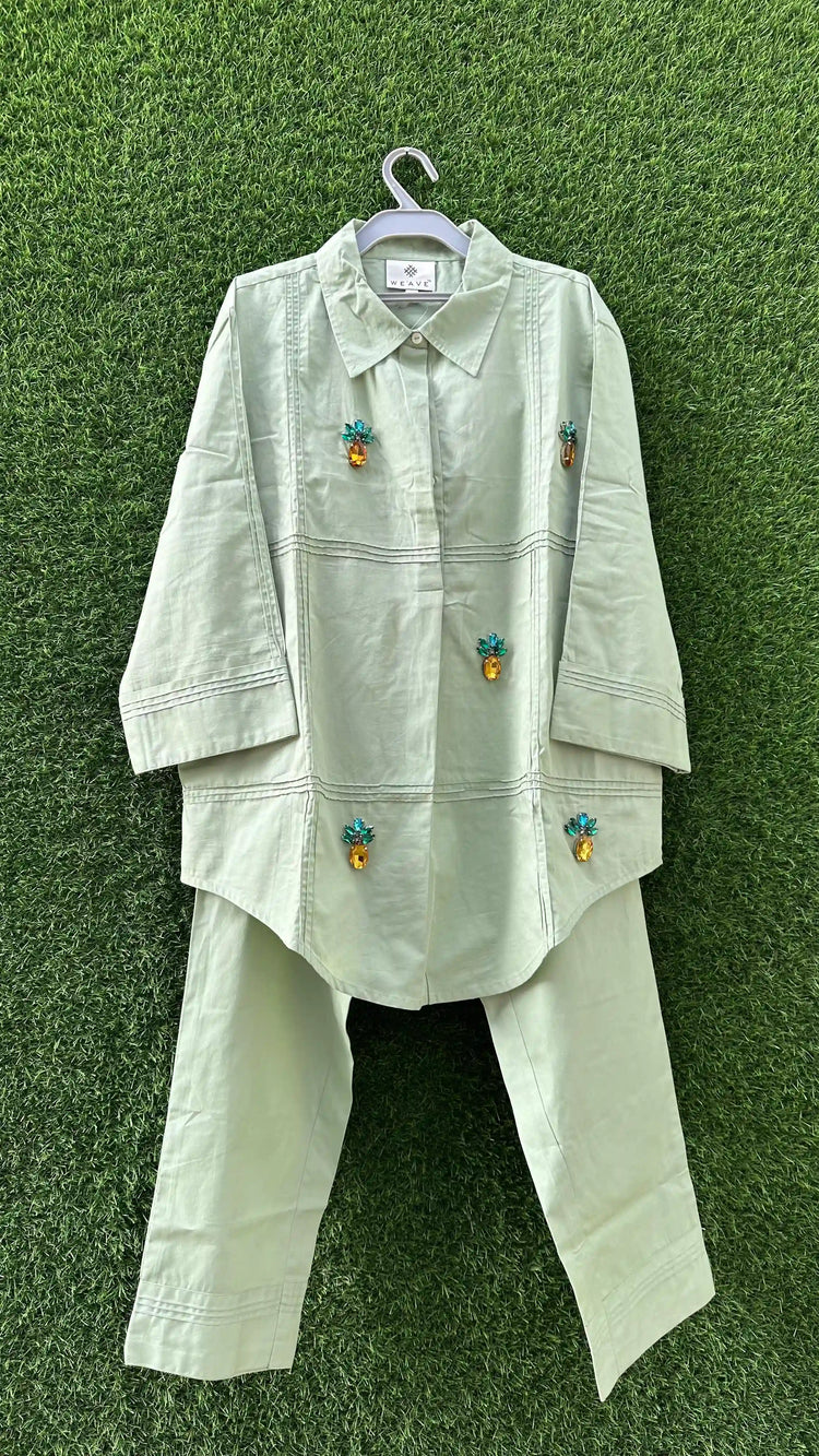 A stylish co-ord set crafted in soft poplin fabric, feature studs with pineapple motifs that adds a feminine charm. The poplin gives a crisp yet breathable texture, making it perfect for everyday comfort with a hint of elegance.