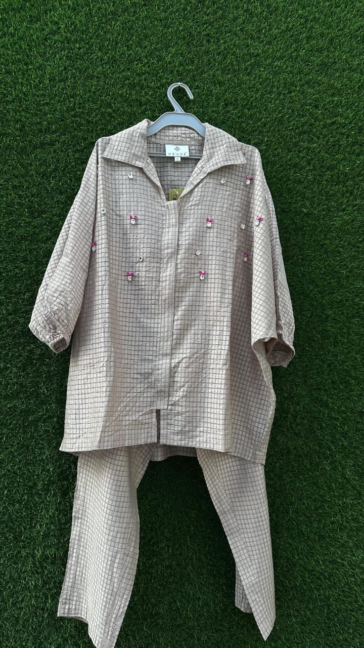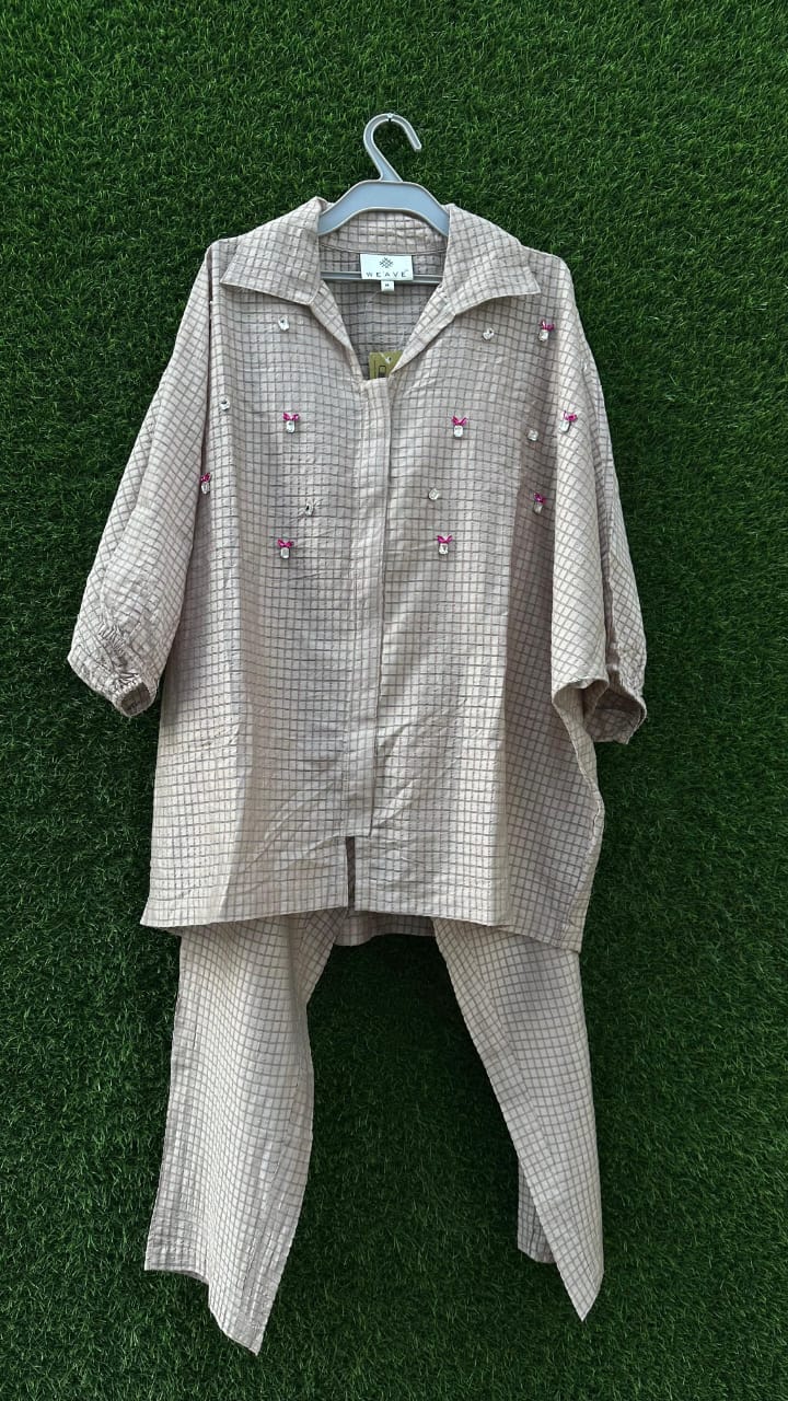 A stylish co-ord set crafted in soft poplin fabric, feature studs that adds a feminine charm. The poplin gives a crisp yet breathable texture, making it perfect for everyday comfort with a hint of elegance