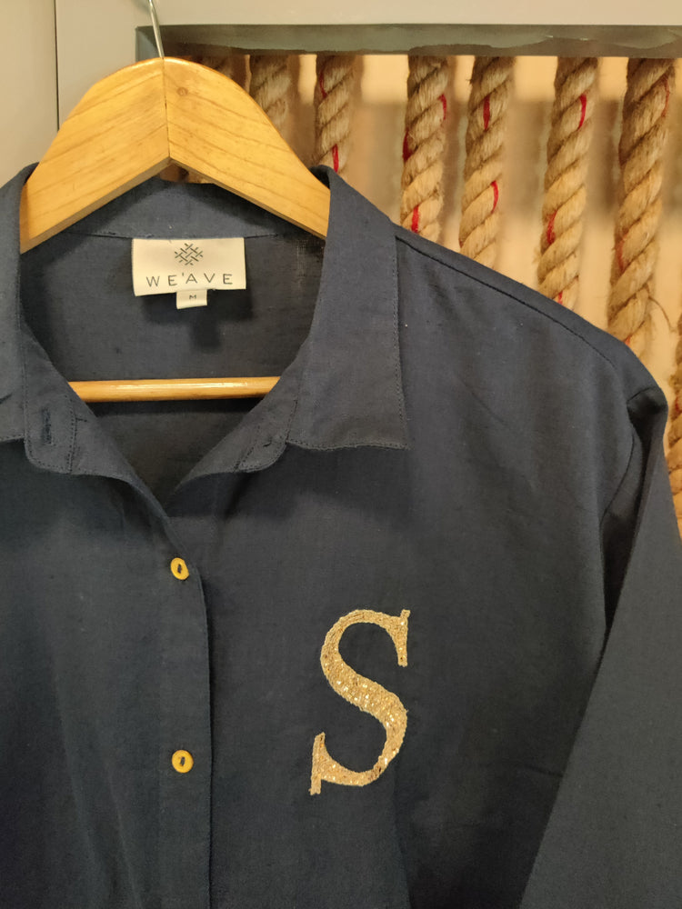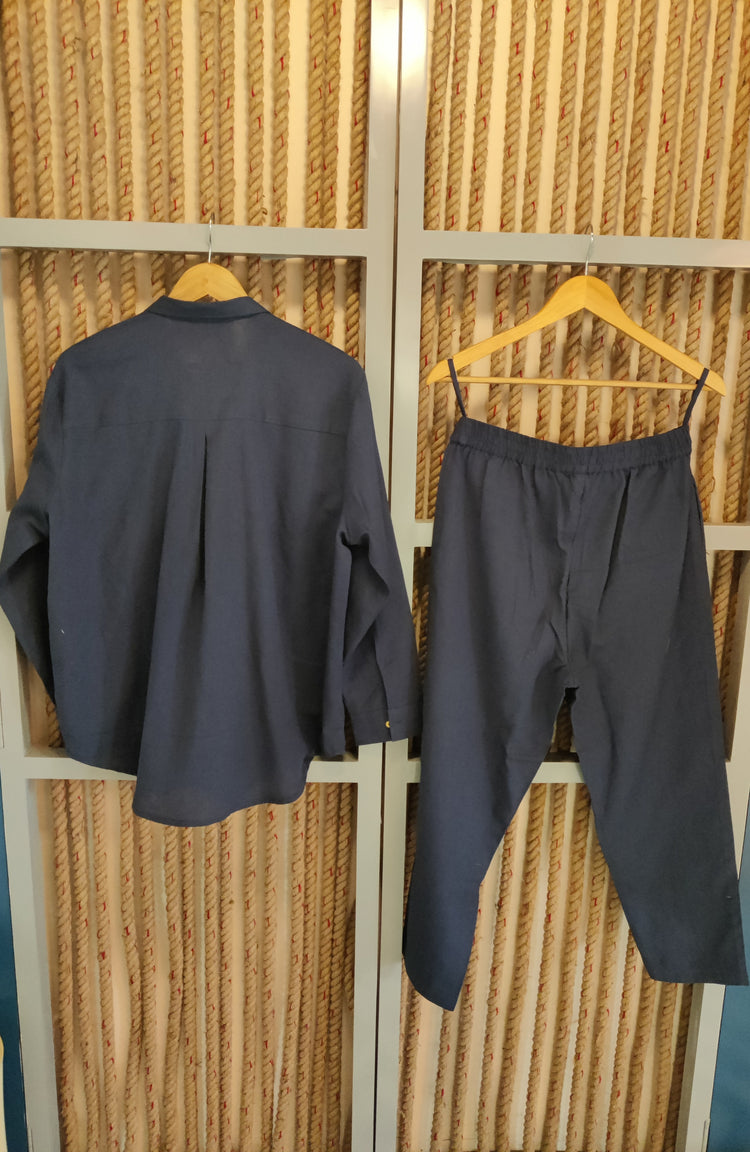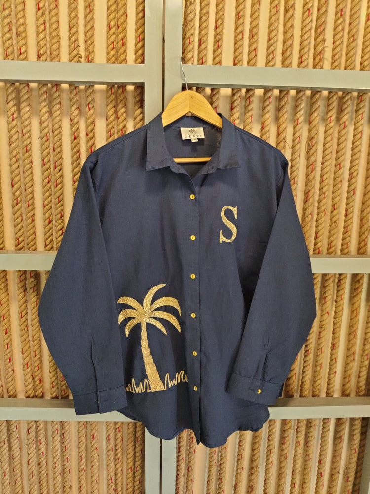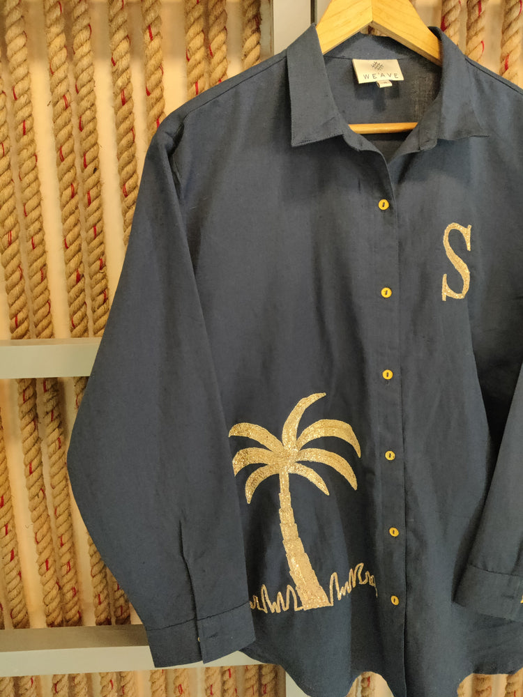 Make a statement with the Navy Palm Tree Co-ord Set, featuring a customizable shirt and pants adorned with intricate gota work. Personalize your look by adding your initials to the shirt, combining tradition with individuality. Perfect for special occasions or everyday wear, this ensemble offers a unique touch to your wardrobe while ensuring you stand out in style.
