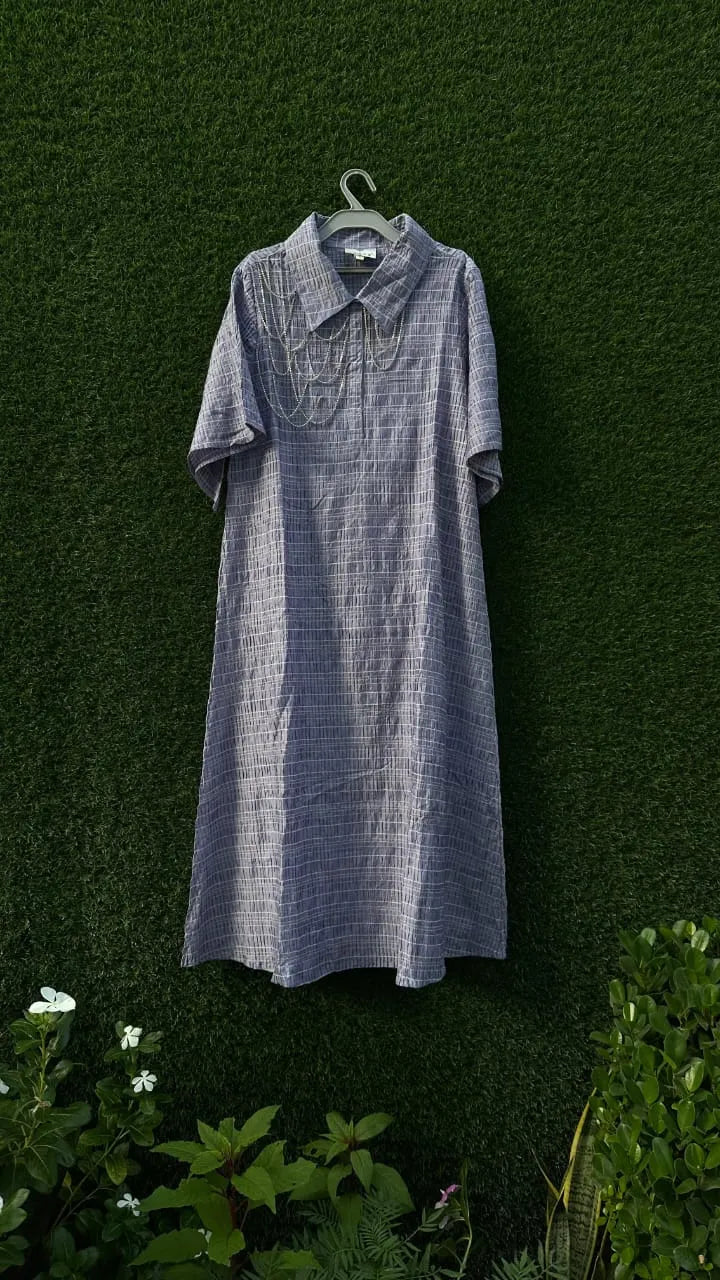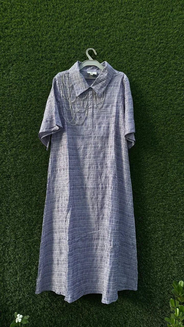 A stylish dress crafted in soft poplin fabric, feature chain that adds a feminine charm. The poplin gives a crisp yet breathable texture, making it perfect for everyday comfort with a hint of elegance.