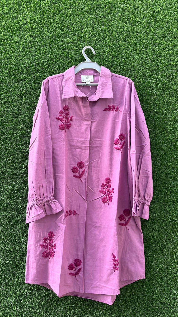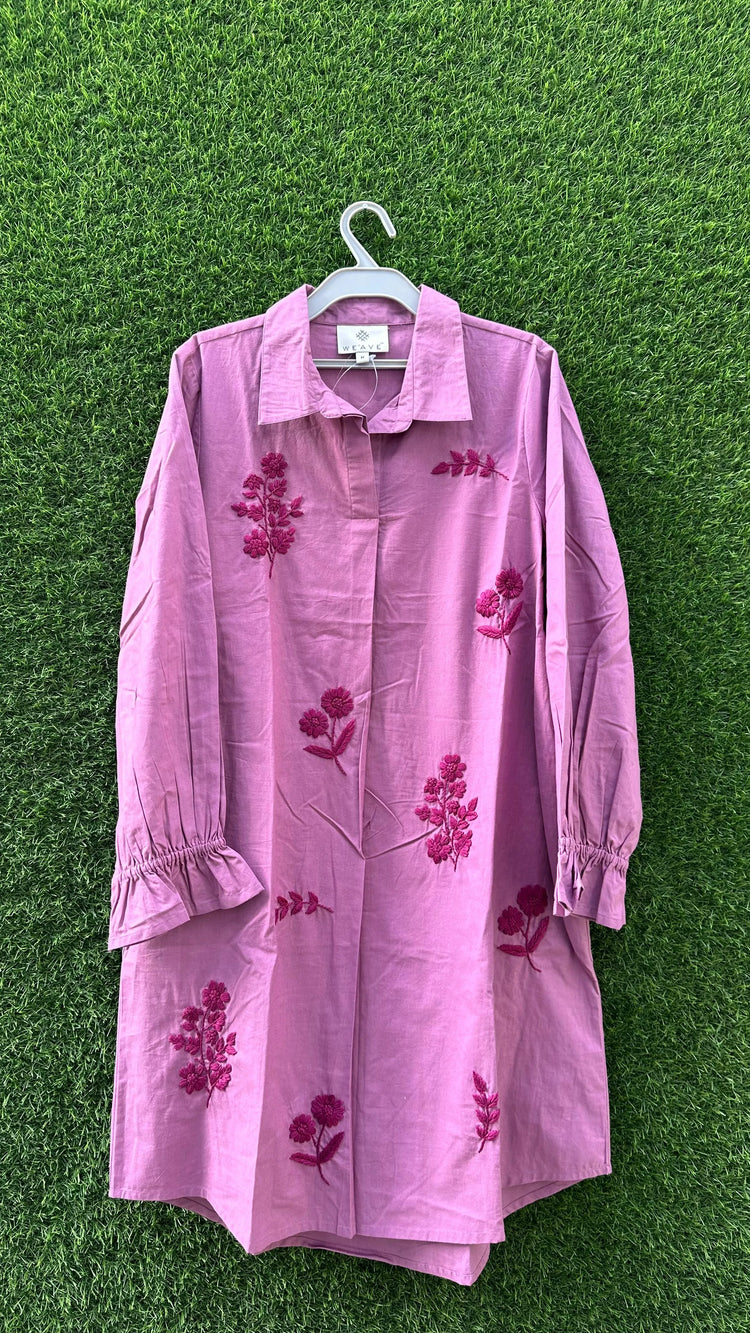 A stylish dress crafted in soft poplin fabric, feature hand embroiderey with daisy flowers that adds a feminine charm. The poplin gives a crisp yet breathable texture, making it perfect for everyday comfort with a hint of elegance