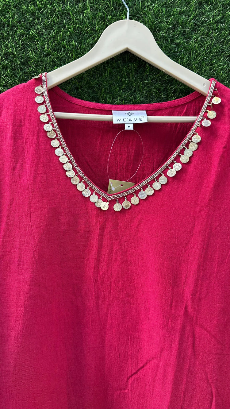 The kurta features handcrafted coin Lace embellishments along the neckline and hemline, adding a delicate shimmer and a hint of bohemian allure. Paired with coordinated straight-fit pants, this outfit is ideal for resort getaways, festive brunches, or evening gatherings.