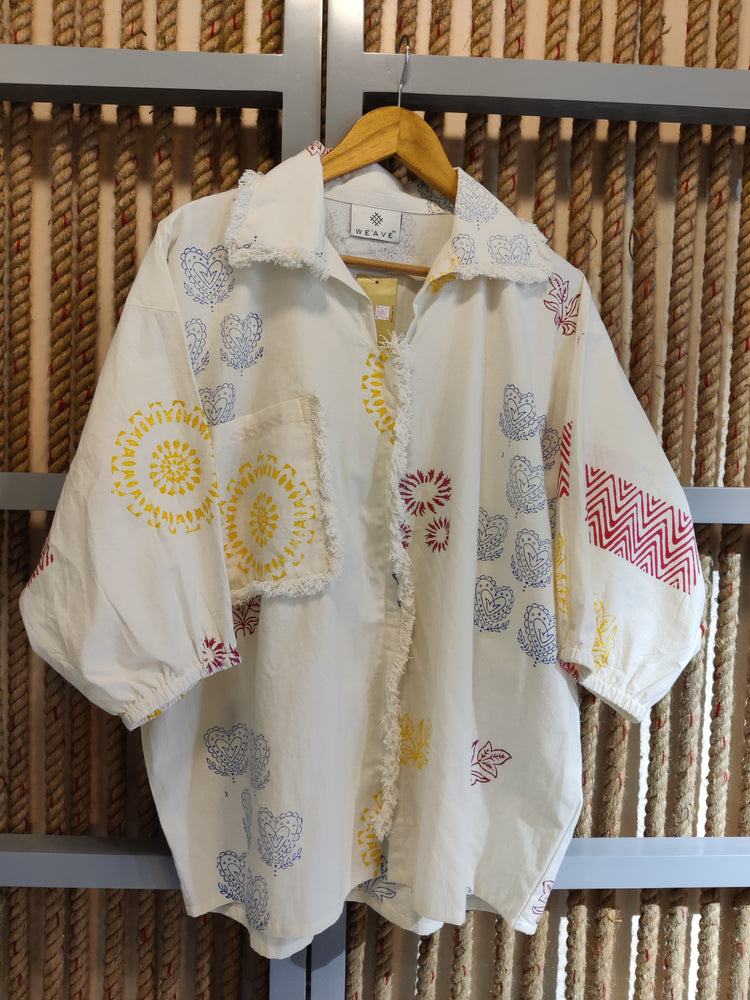 Embrace effortless style with our Multi Color Block Print Shirt. This vibrant piece features a charming block print, accented by a stylish shiffly pocket and delicate lace detailing along the placket, pocket, and collar. Perfect for layering or wearing solo, it brings a touch of bohemian flair to any outfit.