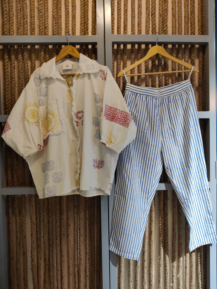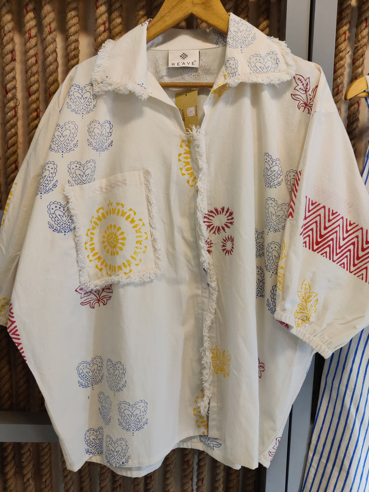 Embrace effortless style with our Multi Color Block Print Shirt Set. This vibrant piece features a charming block print, accented by a stylish shiffly pocket and delicate lace detailing along the placket, pocket, and collar. Perfect for layering or wearing solo, it brings a touch of bohemian flair to any outfit.
