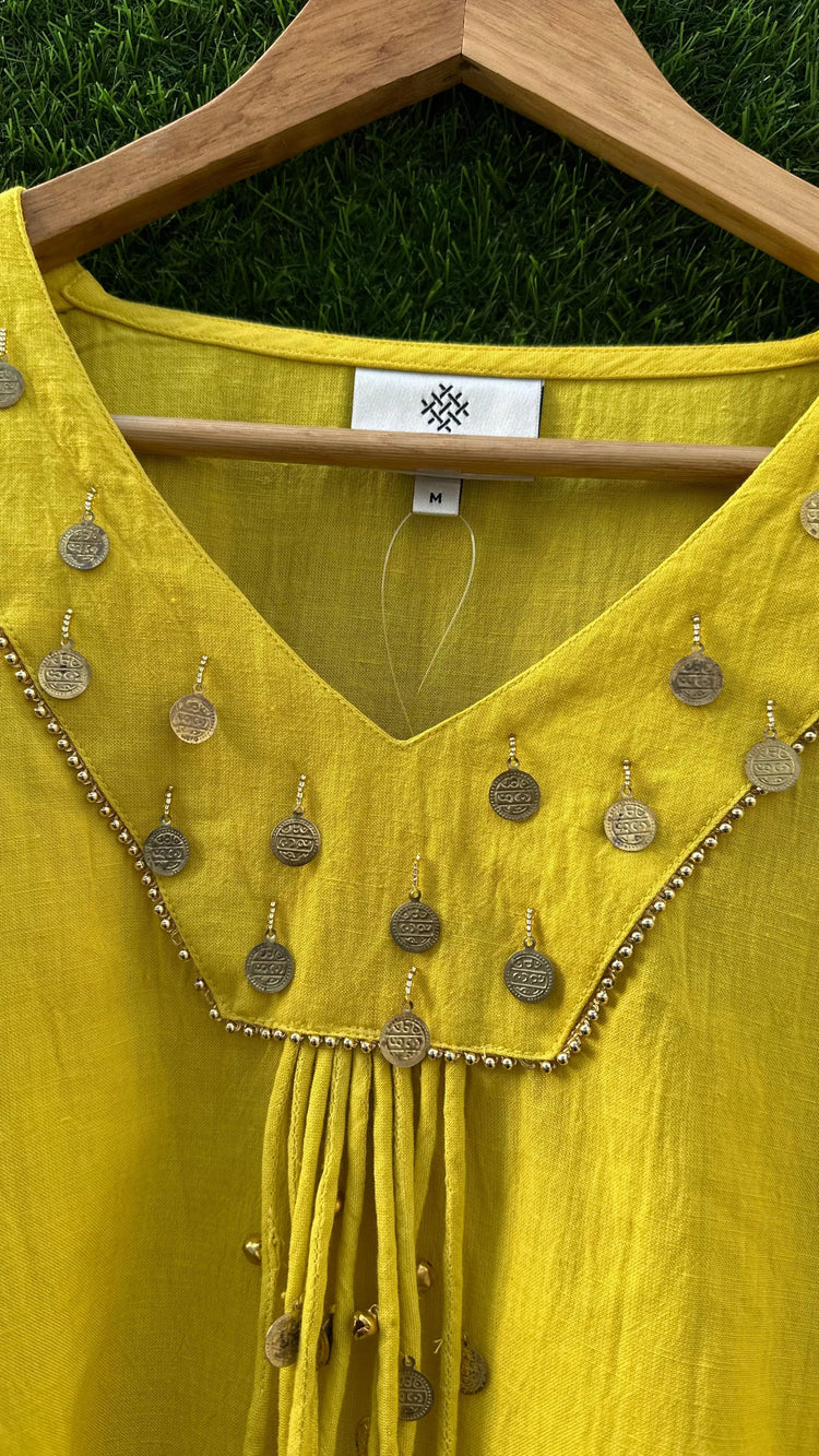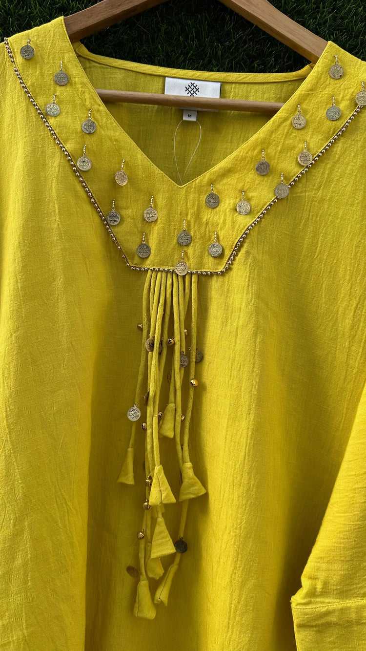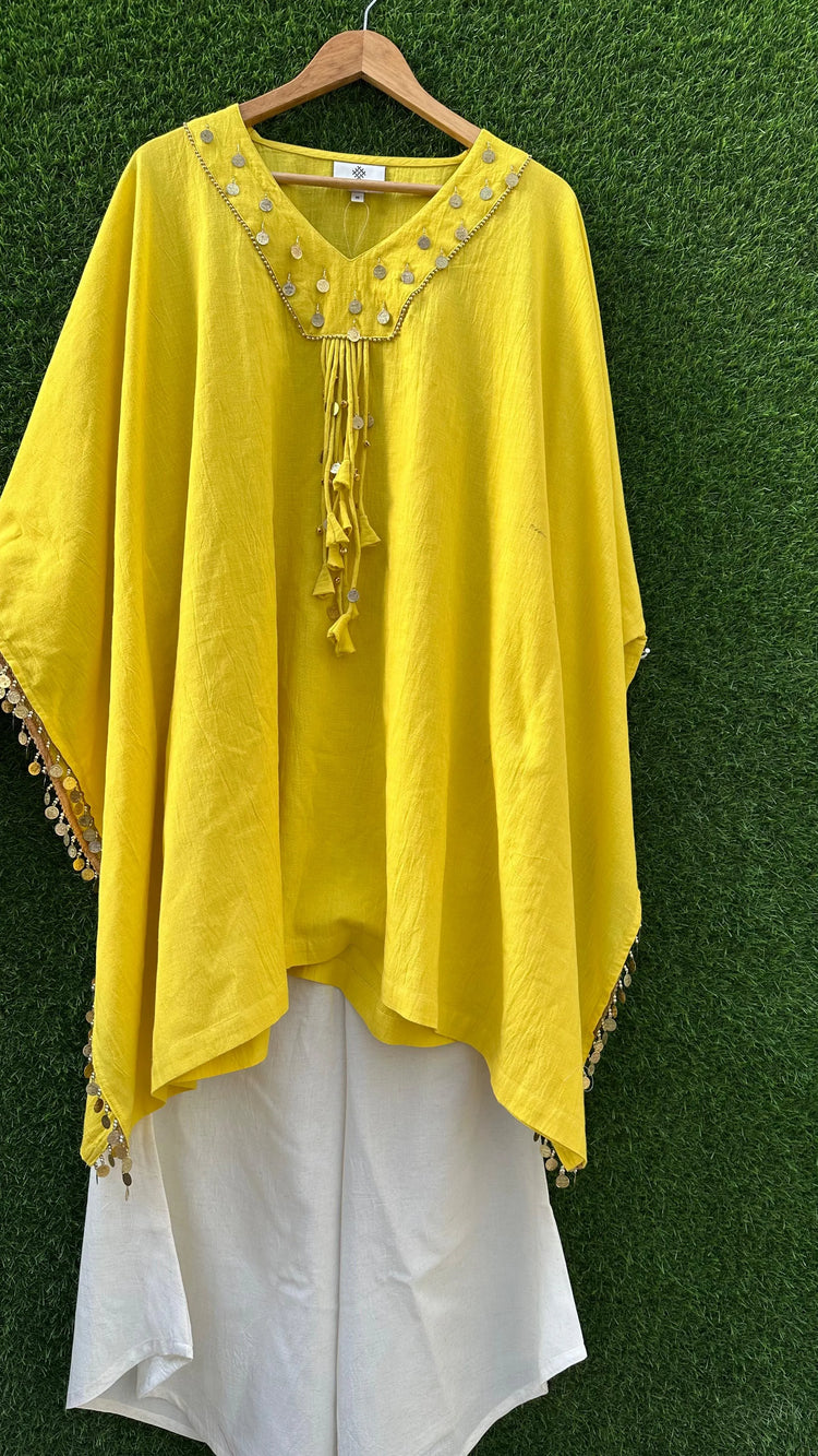 The kaftan features handcrafted coin Lace embellishments along the neckline and borders, adding a delicate shimmer and a hint of bohemian allure. Paired with coordinated straight-fit pants, this outfit is ideal for resort getaways, festive brunches, or evening gatherings.