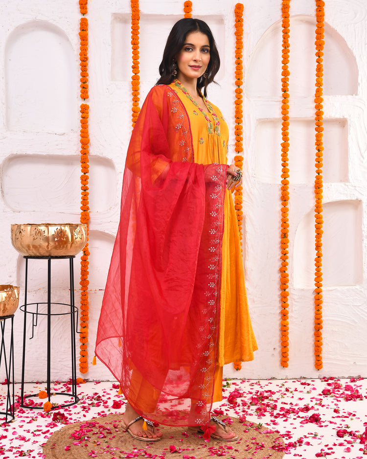 - Color : Red(Dupatta) and Mustard(Kurta, Pant)