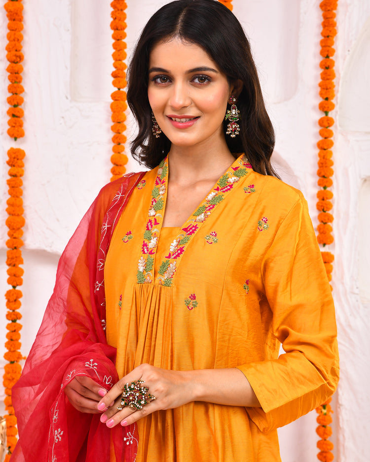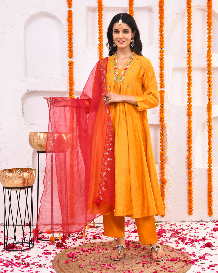 A three piece kurta set including kurta, pant and dupatta, adorned with meticulously done hand embroidered neckline and embroidered orzanga dupatta making it perfect choice for pooja or other festive celebrations.